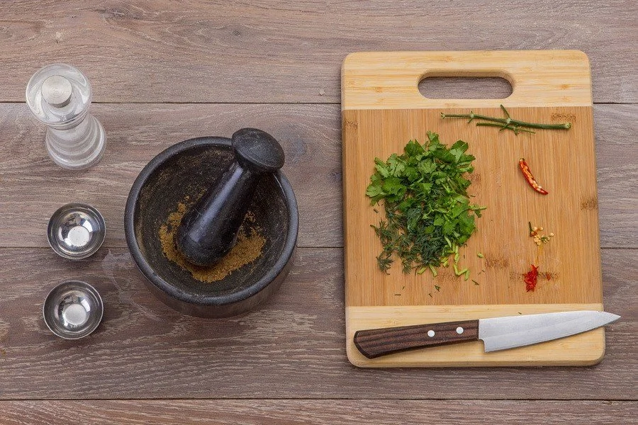 ШАГ 3 Растолките в ступке или мелко нарубите ножом зиру и кориандр, очистите от семян половину перца чили, нарежьте мелко, отделите веточки укропа от стеблей, кинзу и листья укропа мелко порубите.