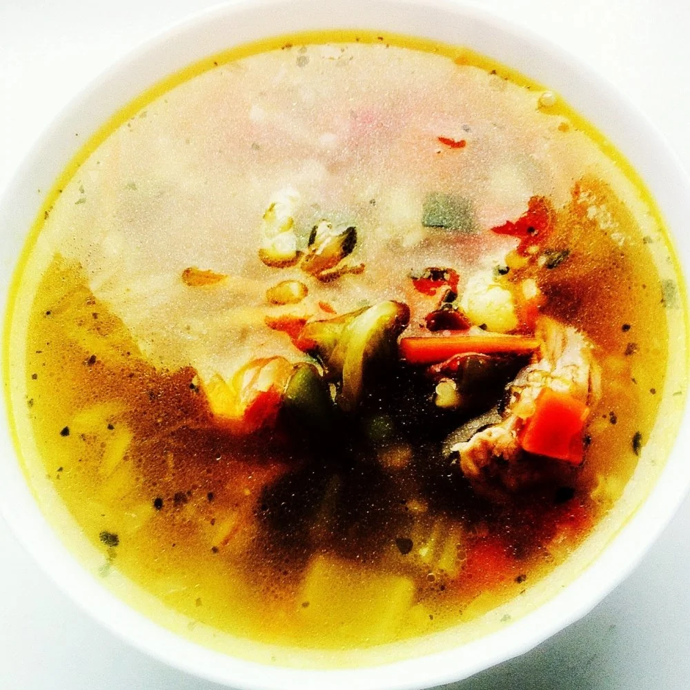 ШАГ 4 Добавьте пассерованные овощи и мясо в бульон. Посолите по вкусу.