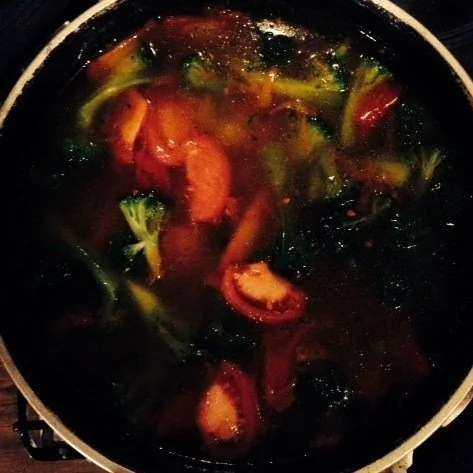 ШАГ 3 Выньте готовую курицу из бульона. И добавьте в бульон брокколи, картофель (картофель нарежьте кубиками, брокколи разрежьте на мелкие части), обжаренную смесь из лука и моркови, помидоры (помидоры нарежьте дольками). Варите овощи 15–20 минут. Добавьте соль, перец.