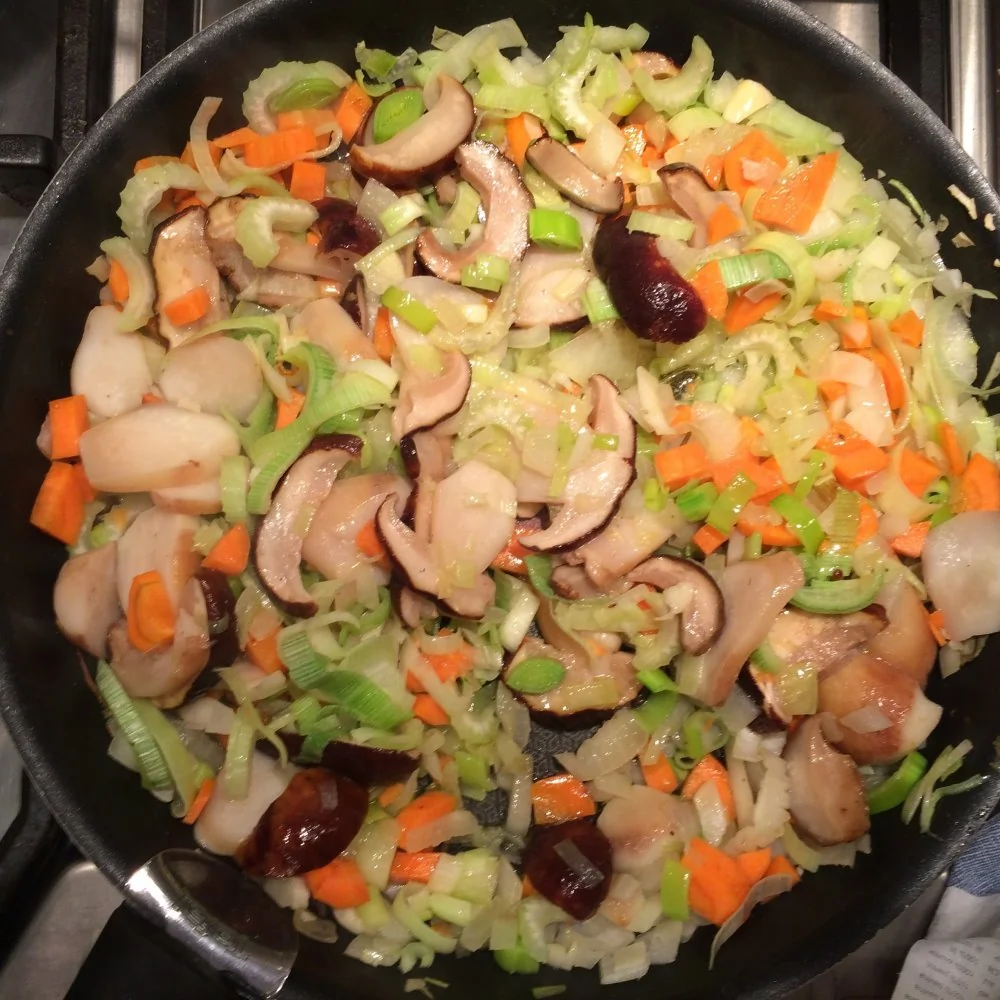 ШАГ 7 Добавьте репу, листья шпината, морковь и сельдерей и нарезанные грибы. Тушите на медленном огне около 10 минут.