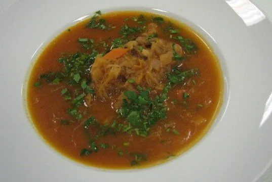 ШАГ 3 Сухие грибы заварить кипятком на 1 час, достать, нарезать и обжарить, добавить в суп вместе с бульоном от сухих грибов. Довести до готовности, посыпать специями, при отдаче декорировать петрушкой (сметана в соуснике (по желанию)).