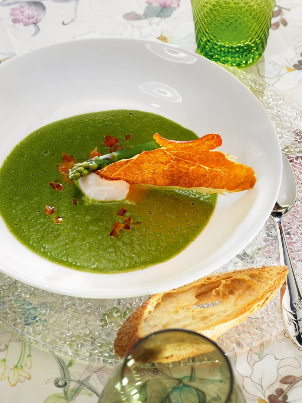 ШАГ 2 Ветчину расстелить на противне, прижать сверху другим противнем и поставить на пятнадцать минут в духовку, разогретую до 180 градусов, потом снять верхний противень и запекать еще пять минут до состояния чипсов. На оливковом масле обжарить мелко нарезанные лук и чеснок в течение минуты, добавить измельченную спаржу, куриный бульон и варить пять минут, затем добавить шпинат. Снять с огня, добавить соль и перец и пробить блендером.