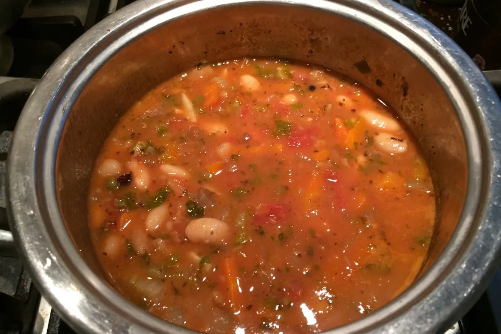 ШАГ 5 Добавьте лук, морковь, орегано и резанные помидоры в собственном соку к супу и варите на медленном огне около от 1 до 1,5 часов. До готовности фасоли.