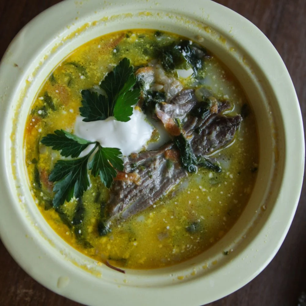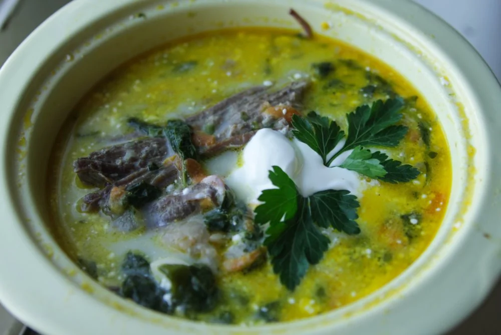 Зеленый борщ с крапивой, черемшой и шпинатом на говяжьем бульоне