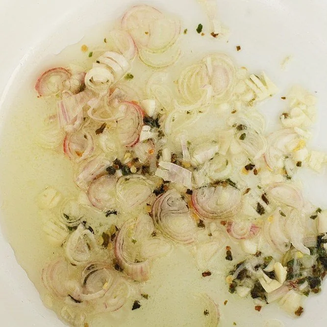 ШАГ 2 Нагрейте оливковое масло в кастрюле с толстым дном на медленном огне, обжарьте лук и чеснок вместе с перцем чили до мягкости.