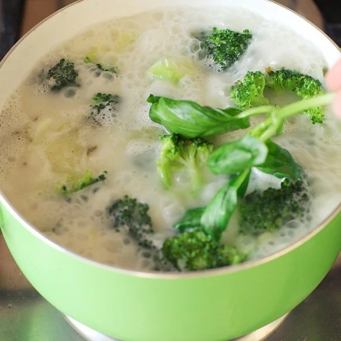 ШАГ 5 Добавьте кокосовое молоко и базилик, оставив пару листиков для украшения, и снимите с огня.