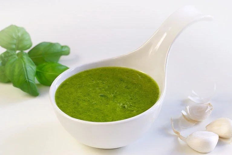 ШАГ 4 Зелень зеленого базилика, укропа и петрушки вымыть и обсушить. Ореховую смесь: миндаль, кешью, арахис (если она не обжарена) слегка обжарить. Измельчить в блендере зелень и орехи. Не выключая блендер, влить тонкой струйкой оливковое масло.