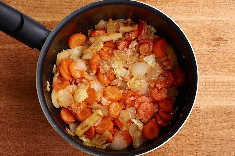 ШАГ 2 Нагрейте сотейник на среднем огне, вылейте подсолнечное масло и обжарьте лук пару минут. Затем добавьте морковь.