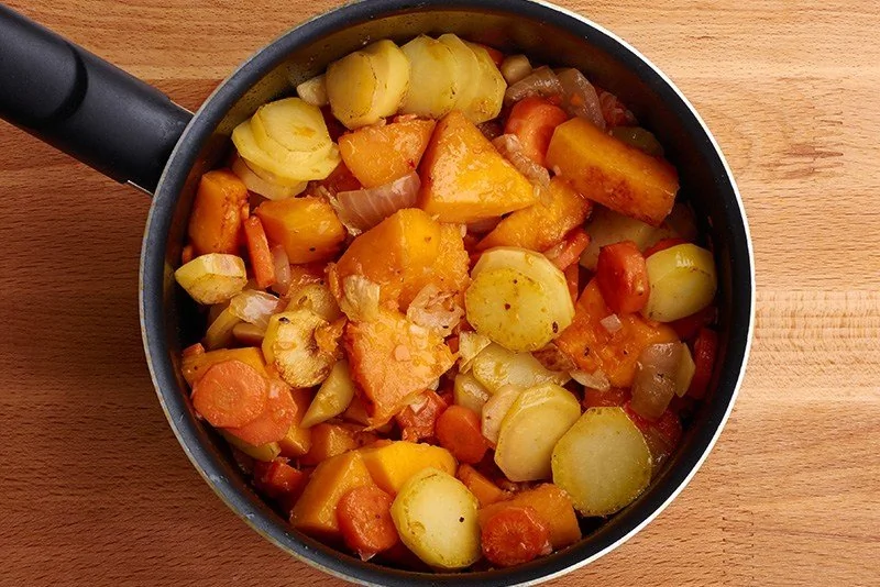 ШАГ 4 Залейте овощи водой или куриным или овощным бульоном — 1 литр на четыре порции. Посолите, поперчите и варите около 25–30 минут на малом огне. За пять минут до конца варки добавьте имбирь и мед. Не допускайте сильного кипения, при необходимости подливайте воду (бульон).