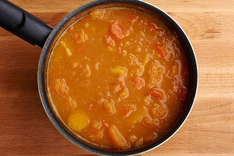 ШАГ 5 Измельчите суп погружным блендером до однородной массы, затем обязательно доведите до кипения. Помешивайте суп, чтобы он не пригорел.