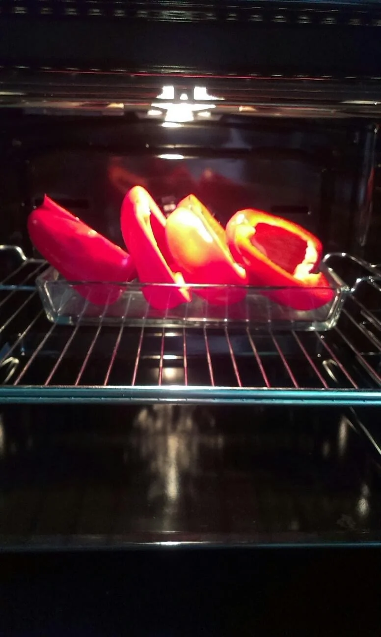 ШАГ 1 Перцы заранее запеките в духовке, выложите в миску, накройте крышкой или пищевой пленкой, дайте остыть. Потом их будет легко очистить от кожи. Можно готовить суп и со свежим перцем, но с запеченным получается вкуснее.