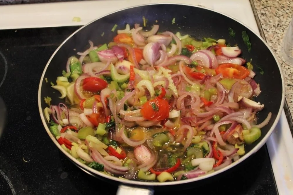 мелко шинкуем и забрасываем его в сотейник к луку. Обжариваем 3–5 минут на умеренном огне.