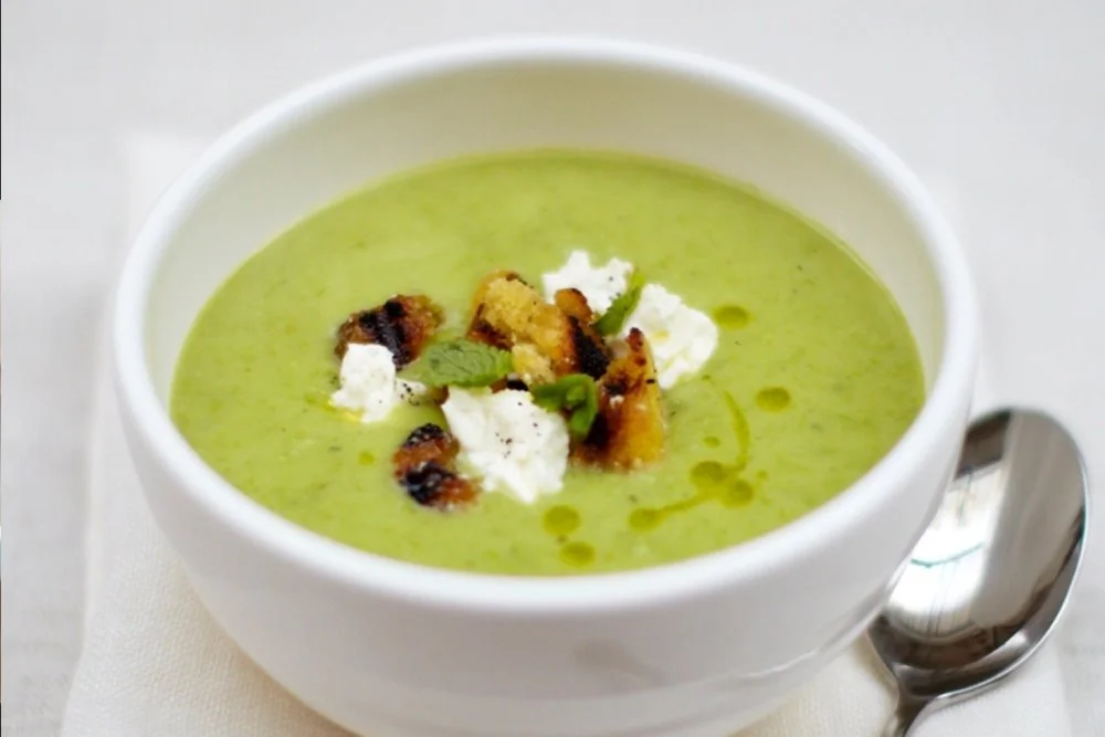 ШАГ 13 3 вариант — чиабатту нарвите руками на мелкие куски, сбрызните оливковым масло и обжарьте на сковороде гриль. Смешайте ее с оставшимися мятными листьями и мелко нарубленной фетой и аккуратно положите в суп перед подачей.