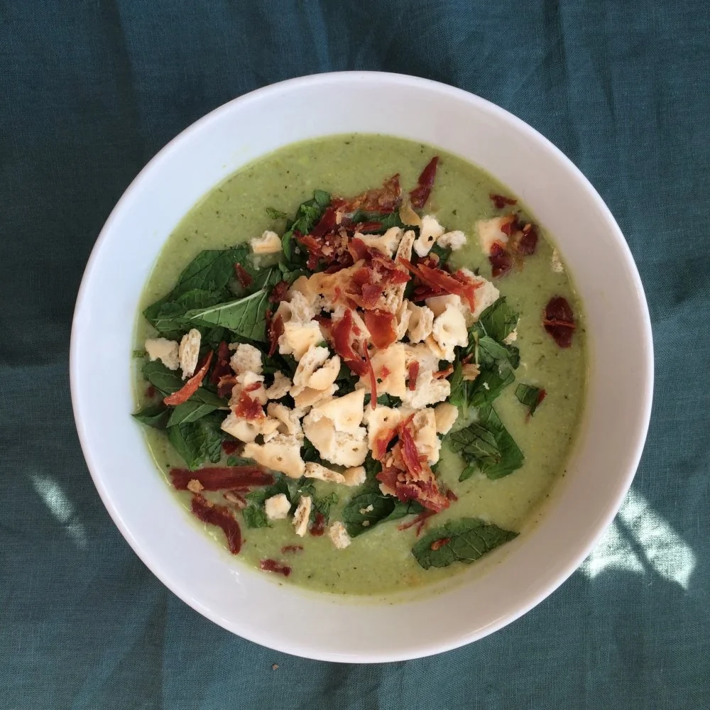 ШАГ 11 Для заправки есть 3 варианта: 1 вариант — мелко нарубите листья мяты, тонко нарезанную грудинку (хамон или прошутто) подсушите в духовке на противне на бумаге для запекания около 10 минут при 180 градусах до состояния чипсов. Можно брать любое мясо с минимальным содержанием жира. Оно даст супу соленую нотку. После этого мелко растолките мясные чипсы. Несоленые крекеры (соли будет достаточно и в мясе) растолките в ступке на не крупные куски но не в крошку). Все это смешайте насыпьте в каждую тарелку перед подачей.