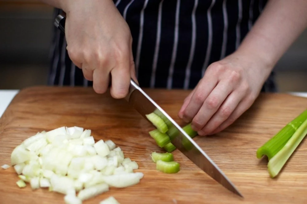 ШАГ 1 Стебель сельдерея нарежьте кусками около 0,5 см; если стебель толстый, можно также предварительно разрезать его вдоль.