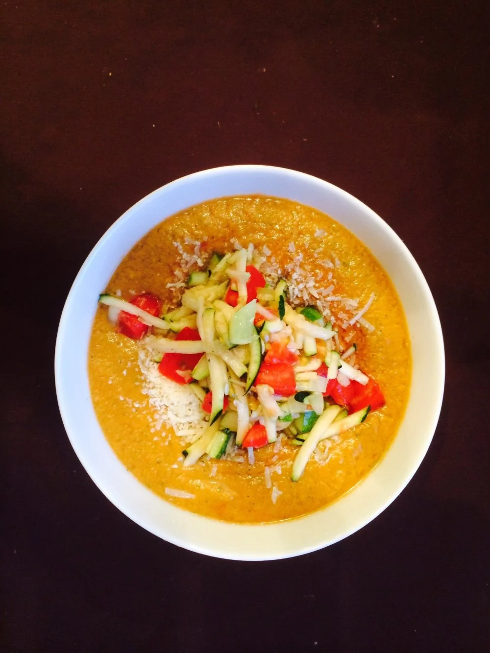 ШАГ 4 Измельчите в блендере 3/4 массы помидоров, стакан томатного сока, красный перец, половину цукини, половину огурцов, мелко нарезанный лук, чеснок, оливковое масло, сок лимона, листья базаилика. Посолите, поперчите, можно добавить красный острый перец.