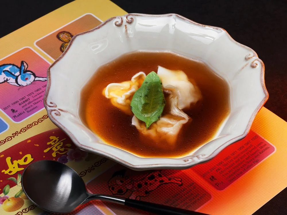 Тесто вонтон Очищенные королевские креветки Свиная вырезка Сахар Имбирь Куриный бульон Кунжутное масло Зеленый лук Сливовый соус Молотый белый перец Консервированные грибы цаогу Молодой шпинат Соевый соус Супы Китайская кухня Пельмени