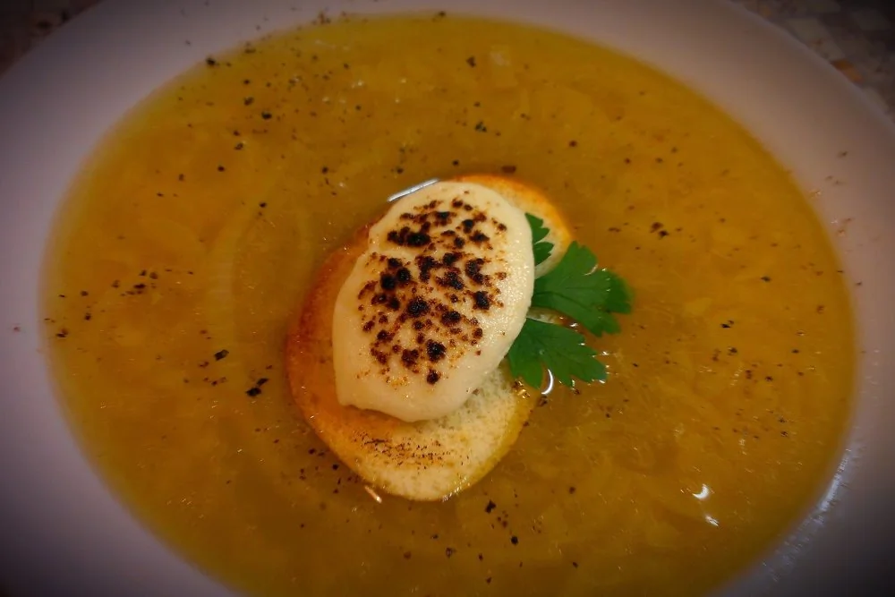 Ингредиенты для приготовления Луковый суп с меренгой из козьего сыра: