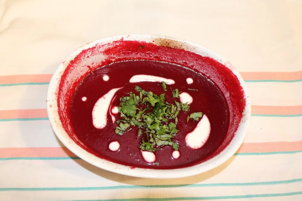 ШАГ 4 Извлечь из духовки свеклу, налить в емкость со свеклой куриный бульон и все взбить блендером до однородной массы.