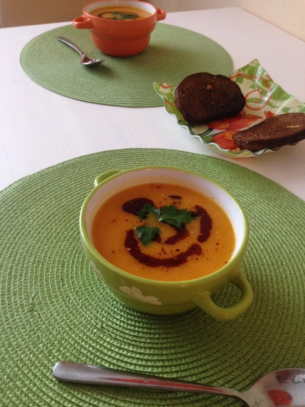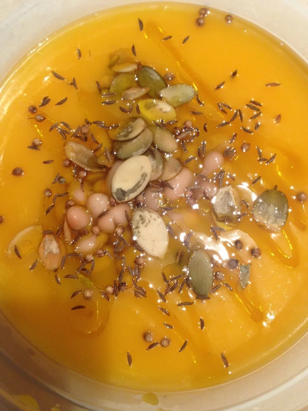ШАГ 4 Разлить по тарелкам, украсить каплями тыквенного масла и молотым чили.