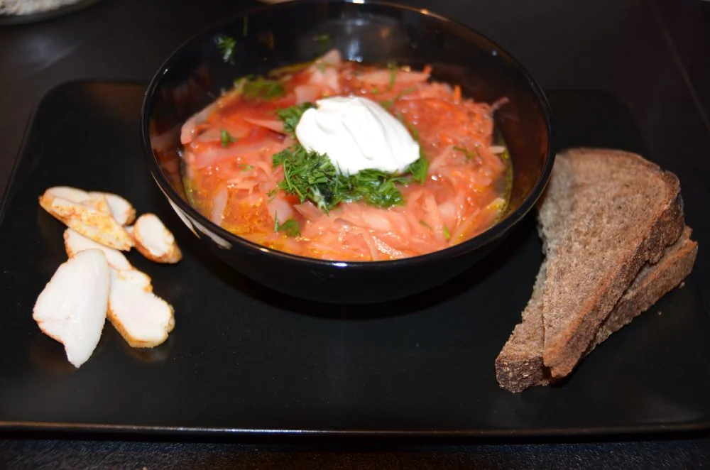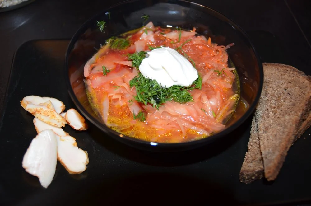 ШАГ 7 Через 10 минут борщ готов. Дайте ему настояться еще минут 30, затем разлейте по глубоким тарелкам, подайте со сметаной, черным хлебом, натертым чесноком и салом! (3 последних ингредиента по вкусу, но черный хлеб, считаю, обязателен).