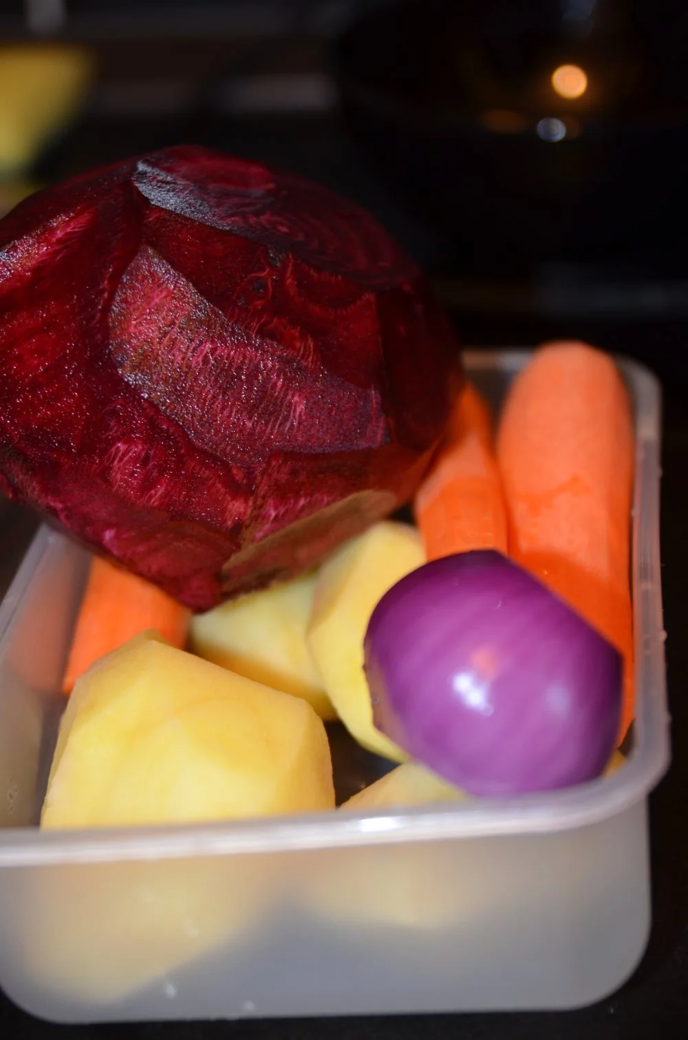 ШАГ 5 Пока варится картофель, очистить и хорошо вымыть морковь, свеклу, лук (чеснок не трогаем, он для подачи), натереть отдельно морковь и свеклу на крупной терке, лук мелко нарубить. Разогреть в сковороде растительное масло пару ложек, но можно спокойно обойтись без него, поэтому не писала в состав. Сначала обжарить лук, затем в ту же сковороду выложить морковь, обжарить, затем туда же добавить свеклу, жарить все вместе. Чтобы овощи остались яркими, добавьте к ним в сковороду уксус (я использую именно красный винный, чтобы, во-первых, не брать такой, помните, советский, у которого надо крышку ножницами срезать, а, во-вторых, с винным уксусом борщ становится кислее и насыщеннее).