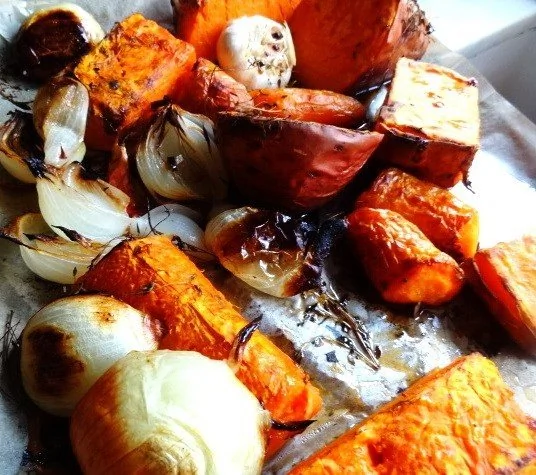 ШАГ 2 Овощи не чистим! Тыкву, батат, лук, морковь нарезать крупными кусками, у чеснока срезать верх, уложить овощи на противень и обвалять в масле. Сверху бросить веточки тимъяна. Поставить в духовку на 30–40 минут до полной мягкости овощей. Где-то минут через 15–20 добавить на противень целый небольшой баклажан.