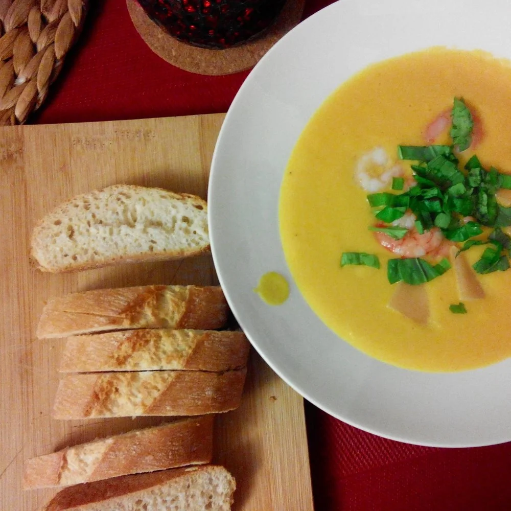 ШАГ 8 Налить суп в тарелку, положить креветки, листья базилика и пластинки пармезана в тарелку.