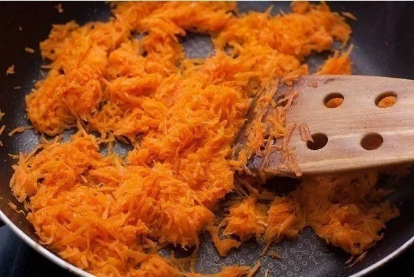 ШАГ 3 Очищенную морковь натрите на мелкой терке. Мелко натертая морковь потом почти незаметна в супе, но хорошо передает ему и цвет и вкус. Слегка обжарьте морковь в растительном масле 3-4 минуты. Не допускайте ее зажаривания, она должна просто стать чуть мягче.