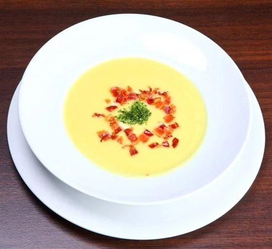 ШАГ 3 Перед подачей на стол по тарелкам разложить поджаренный бекон. Суп украсить порезанным луком или измельченным красным перцем. Подавать с горячим багетом.