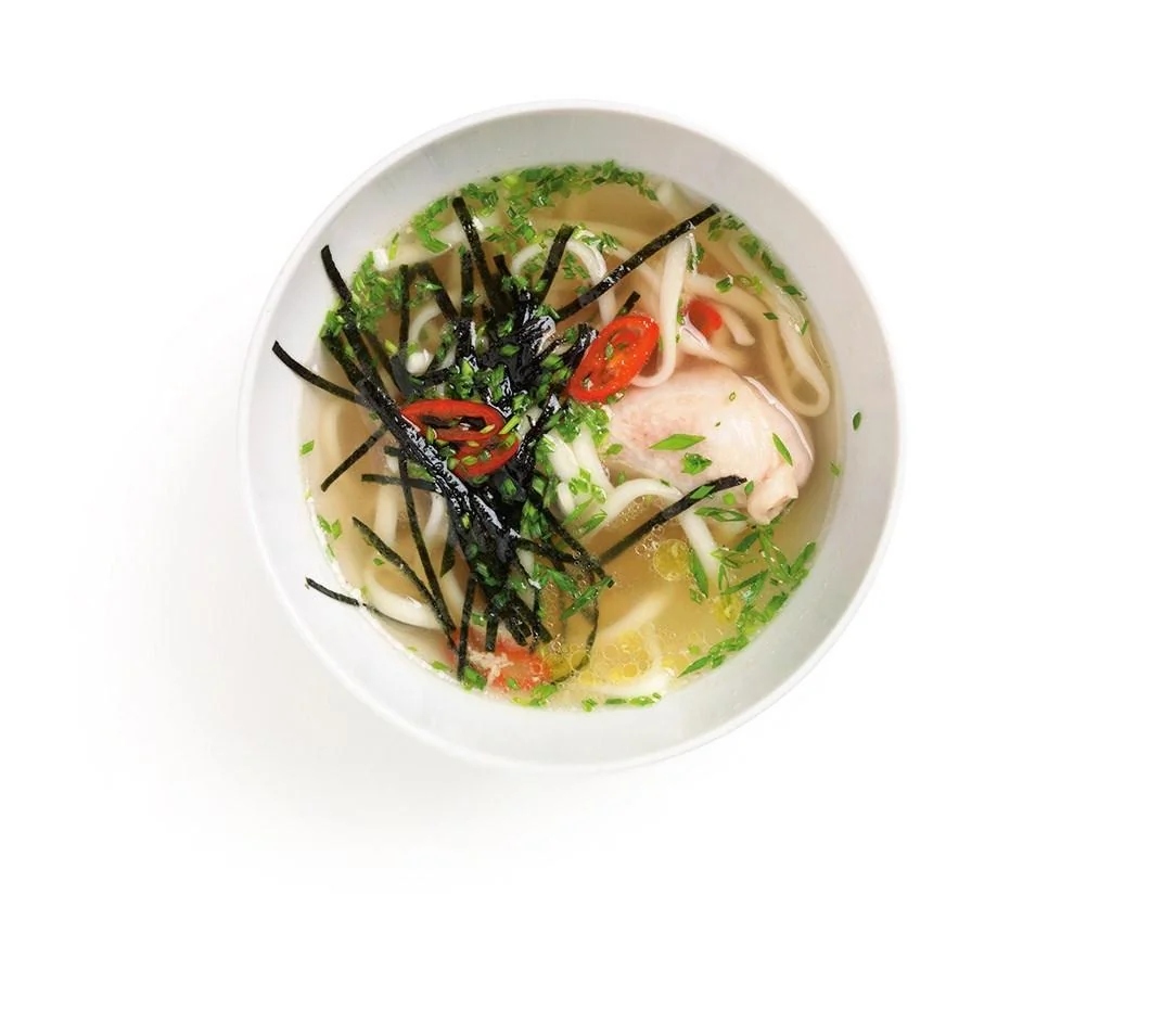 ШАГ 2 Куриный бульон разлить по тарелкам, смешать с чайной ложкой порошка даши, в каждую тарелку положить по куску курицы, лапшу, мелко настрогать зеленый лук и перец, нарезать сухие водоросли тонкой соломкой и поровну распределить по тарелкам, сбрызнув лимонным соком.