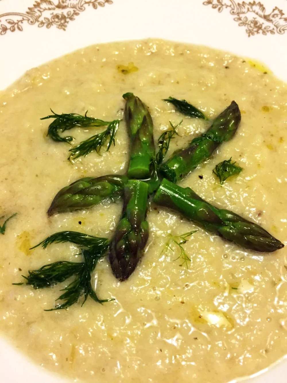 ШАГ 9 Разлить по тарелкам, сверху положить верхушки спаржи, оливковое масло и свежий укроп, и черный молотый перец по желанию.
