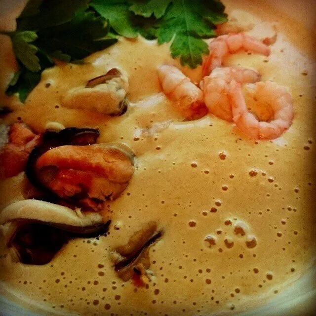 Сырный крем-суп с морепродуктами на рыбном бульоне