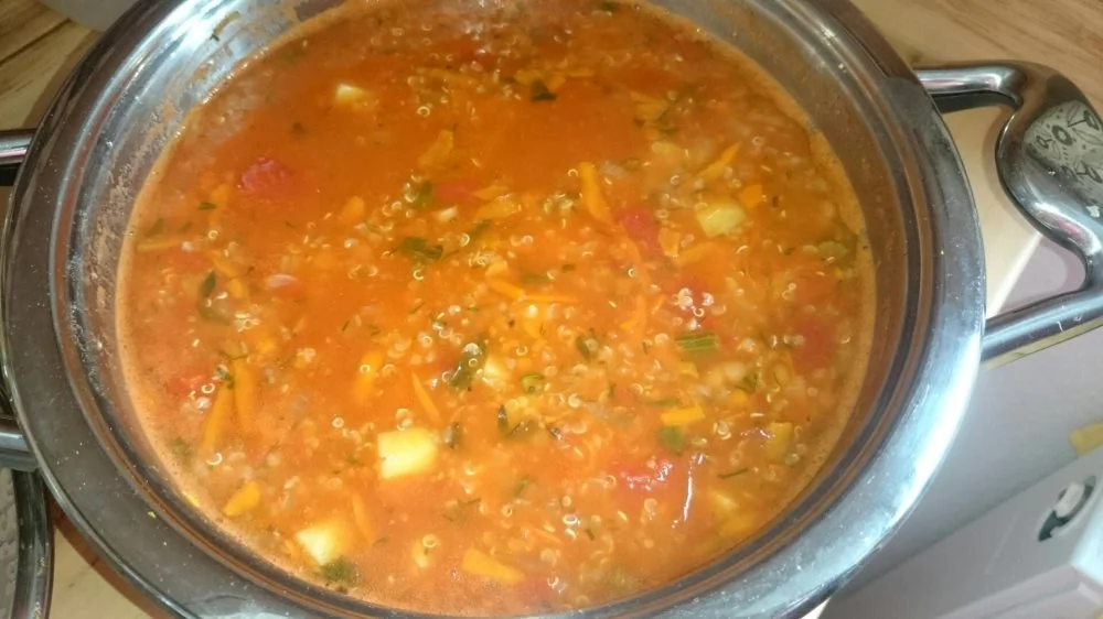 ШАГ 2 Добавить резаные помидоры и овощной бульон. Варить 20 минут.