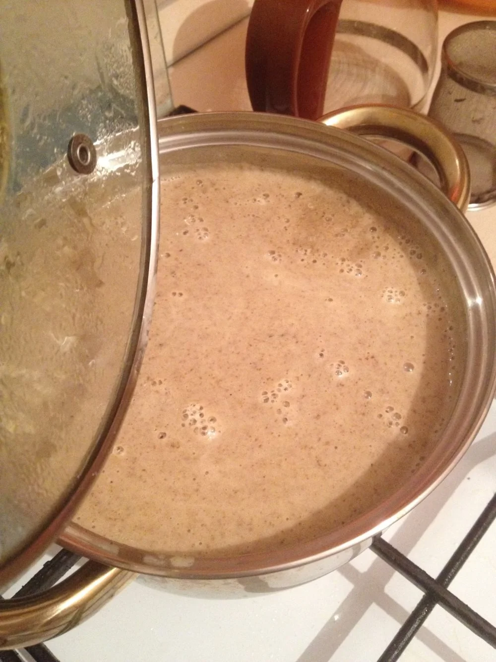 ШАГ 3 Взбить половину сливок, добавить куриный бульон. Залить этой смесью грибы, довести до кипения. Снять с огня и взбить блендером.