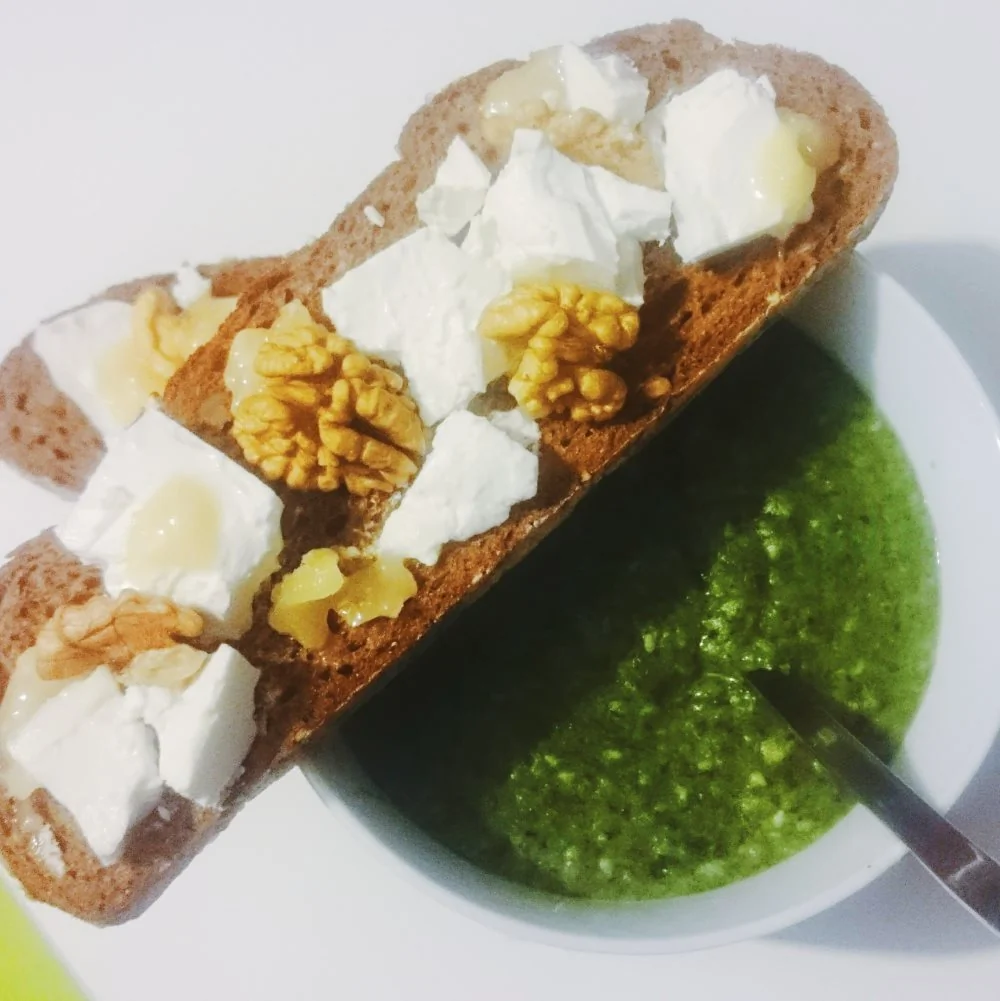 ШАГ 4 Для тартин намазать хлеб брынзой, распределить поверх комочки мёда и четвертинки грецкого ореха.