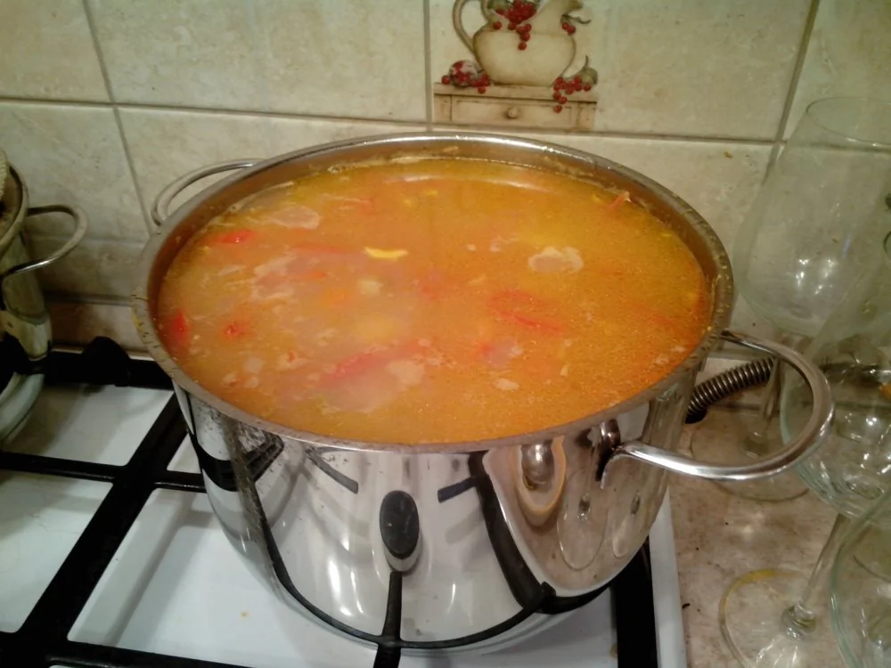 ШАГ 8 Посолить, поперчить и залить бульоном от мидий. При необходимости добавить воды (всего должно получиться около полутора литров жидкости).
