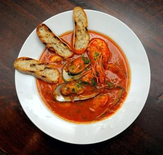 ШАГ 4 Закипятить бульон, оставшийся после варки мидий, кинуть туда нарезанный кубиками картофель.