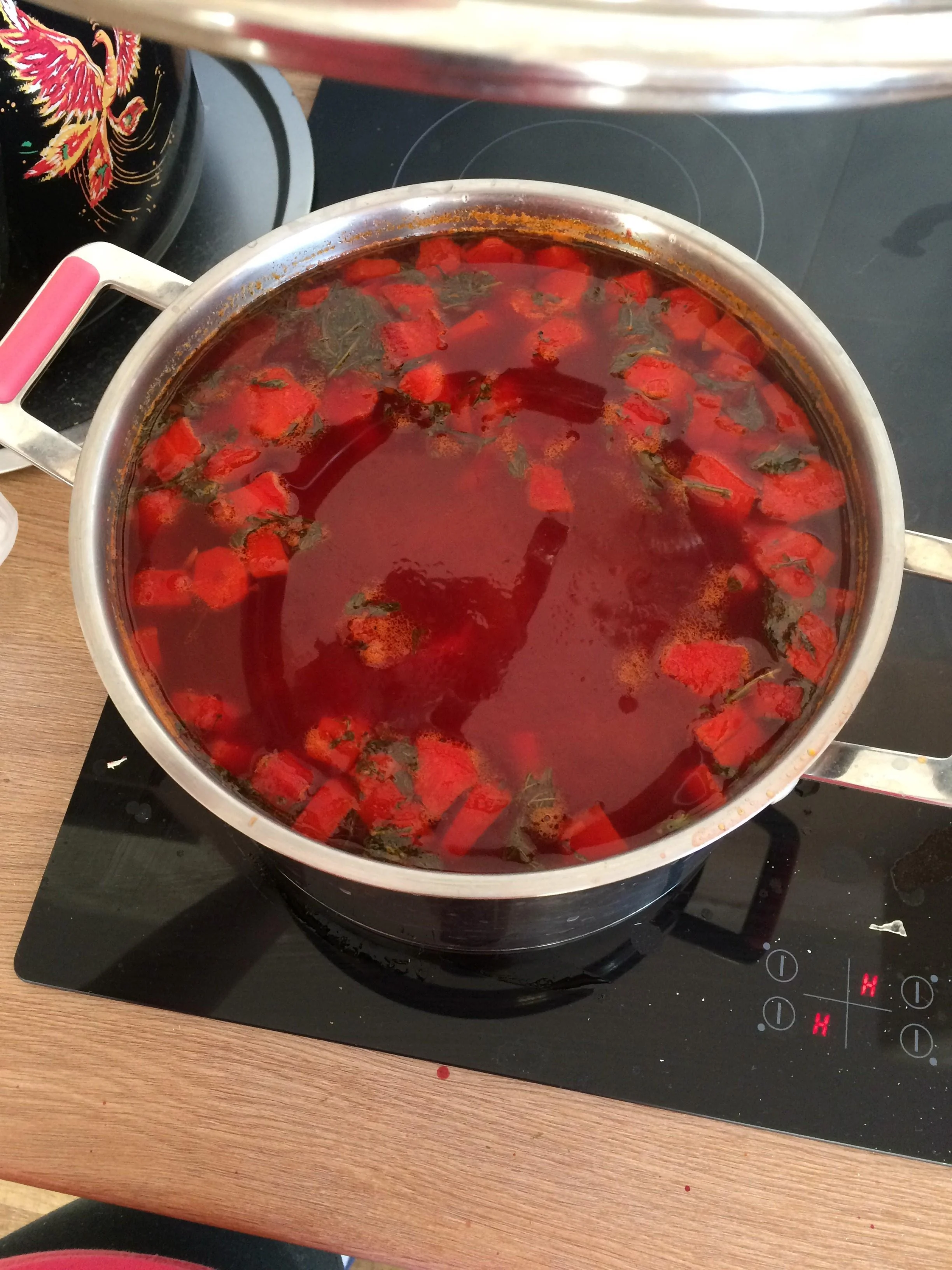 ШАГ 2 В отдельной кастрюле потушить нарезанные свеклу, морковь и петрушку с томатной пастой и небольшим количеством воды.