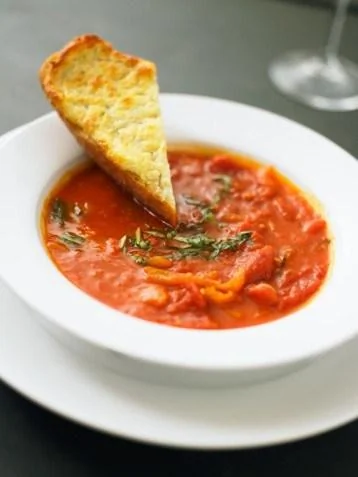 Суп из томатов с копченым беконом с чесночными гренками