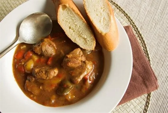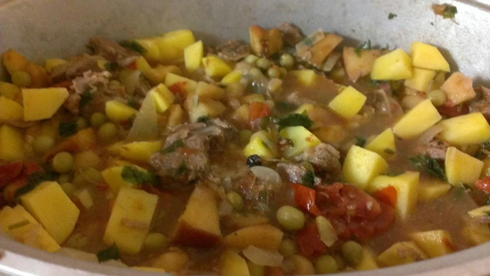 ШАГ 4 Примерно, через 1-1,5 часа в горох переложить сваренные кусочки баранины, отделив все мелкие косточки. После этого добавить процеженный бульон, мелко нарезанный, поджаренный на масле лук, нарезанный картофель и яблоки, томат-пюре, соль, перец и, накрыв крышкой, тушить 20-25 минут.