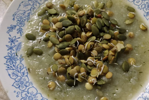 ШАГ 3 Дайте слегка остыть в течение 5 минут. Вмешайте оставшиеся 2 столовые ложки укропа. Пюрируйте суп в блендере небольшими порциями до достижения очень однородной консистенции, добавив немного воды (около ½ стакана), если суп слишком густой. Верните суп в кастрюлю и разогрейте. Приправьте солью и перцем. Украсьте укропом, черным перцем, сбрызните оливковым маслом и щепоткой морской соли.