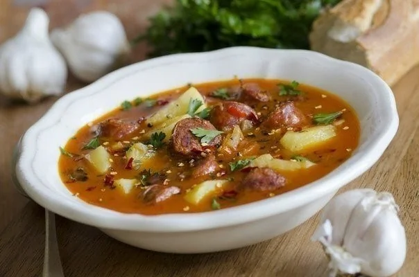 ШАГ 5 В готовый бульон добавить нарезанный картофель, жареные колбаски с овощами, соль, специи, нарежьте зелень, добавьте черный и красный перец. Доведите до кипения и на медленном огне готовьте 15-20 минут.