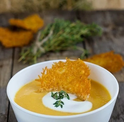 ШАГ 6 Перелить суп в тарелки, украсить йогуртом, веточкой тимьяна и чипсами из пармезана.