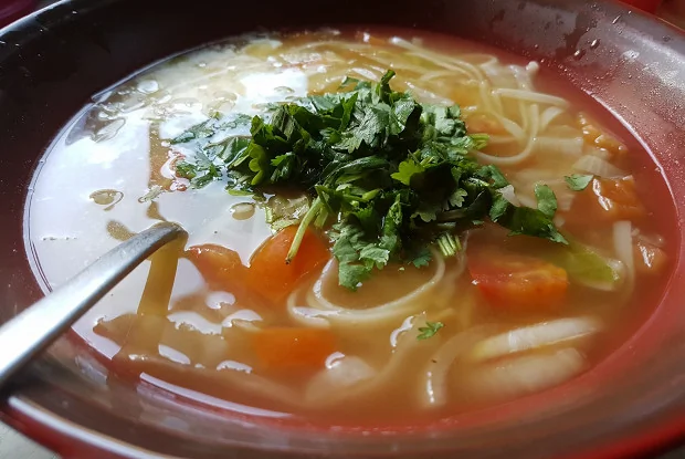 ШАГ 1 Сварить рисовую лапшу (варится моментально 2-3 минуты) в крепком рыбном/ говяжьем/ куринном бульоне. В моем случае рыбный бульон из головы свежего и копченого лососей. Бульон варился с каперсами, имбирем, сельдереем и помидорами, соевым, рыбным соусами.