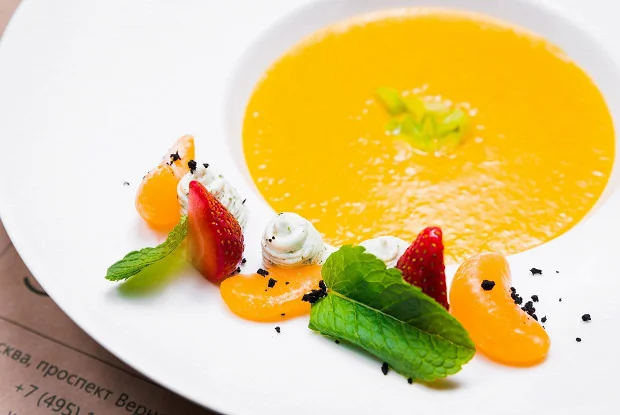 ШАГ 4 Сервировка: 250 г. супа выливаем в тарелку, 10 г. стебля сельдерея нарезаем тонкой соломкой и выкладываем в середину тарелки. На бортики тарелки — 25 г. клубники, 25 сегментов мандарина и 20 г. сырного мусса «крем-чиз». Украшаем листиками мяты.