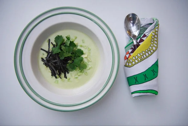 ШАГ 3 Получившуюся смесь вылить в суповую тарелку, сверху красиво выложить кубики авокадо и огурца, соломку из водорослей нори и пучок кинзы.
