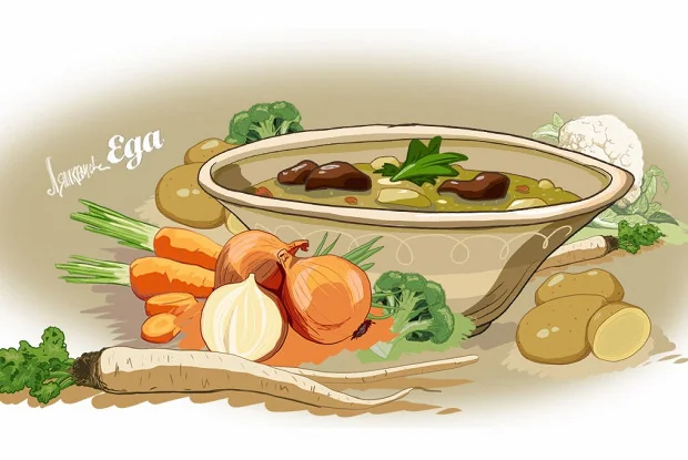 ШАГ 3 Всыпать ½ стакана риса или перловой крупы, положить 1 корень петрушки, 1 корень моркови и 6 картофелин.
