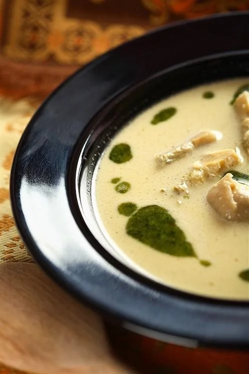 ШАГ 4 Желтки и сливки развести стаканом бульона, влить, постоянно мешая, в остальной бульон. Процедить, довести до кипения.