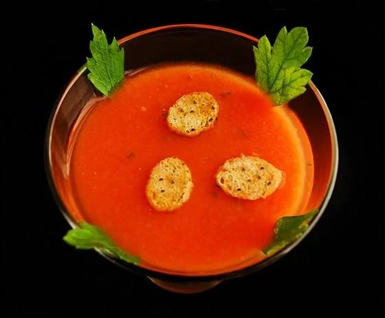 ШАГ 1 В блендере смешайте 6 помидоров, мелко нарезанный лук, чеснок, базилик, укроп, лимонный сок, соль, оливковое масло, изюм, красные перцы, перец халапеньо и 100 миллилитров воды.